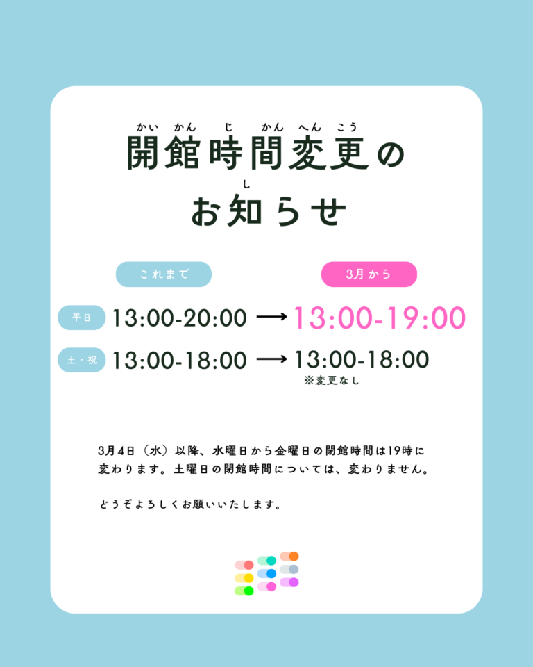 開館時間:水曜と土曜 13:00〜18:00 / 木曜と金曜 15:30〜21:00(年末年始・特別休館日を除く)