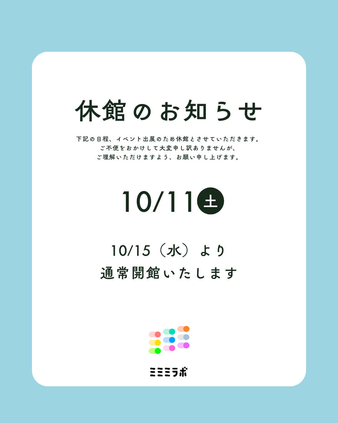 イベント出展のため2025年10月11日(土)は休館いたします。いつもご来館いただいている皆様にはご不便をおかけしますが、ご理解のほどよろしくお願いいたします。