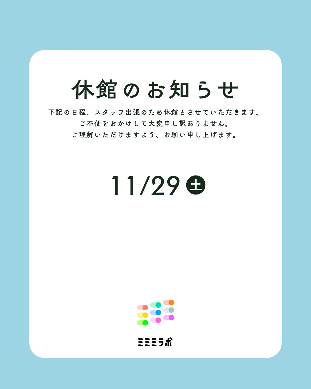 下記の日程、スタッフ出張のため2025年11月29日(土)は休館いたします。いつもご来館いただいている皆様にはご不便をおかけしますが、ご理解のほどよろしくお願いいたします。