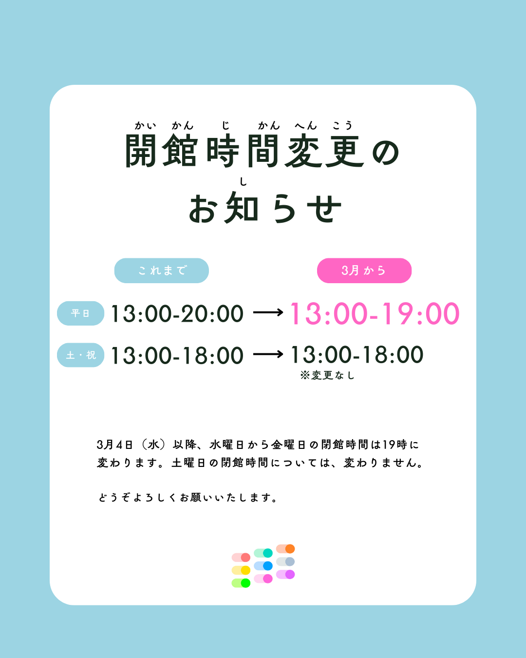 水曜日から金曜日 13:00-19:00土曜日・祝 13:00-18:00(変更なし)